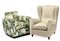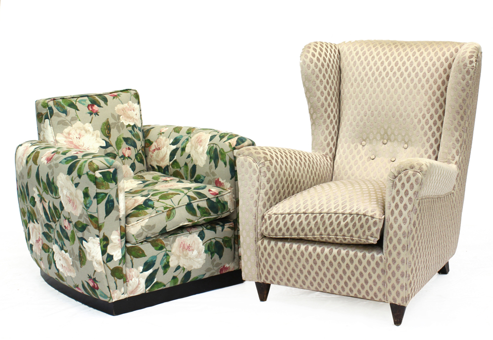 Lotto di due poltrone imbottite e rivestite rispettivamente in tessuto decorato a motivo floreale e geometrico. Italia, rispettivamente anni '30/'40 e anni '50. (cm 90x80x90; ) (lievi difetti e restauri)