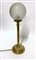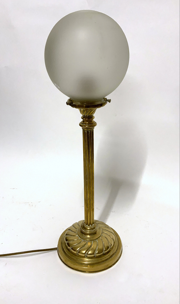 Lampada da tavolo in ottone con fusto a colonna tornita, base tonda e boccia in vetro satinato (h cm 60).