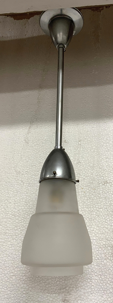 Lampada a sospensione con struttura in metallo e diffusore in vetro acidato sulla superficie esterna. Italia, metà secolo XX. (h cm 65,5) (lievi difetti)