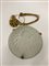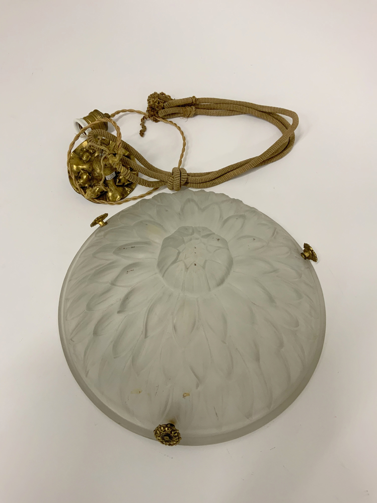 Lampada a sospensione con diffusore a semisfera in vetro stampato e acidato sulla superficie esterna e struttura in metallo dorato e corda. (lievi difetti)