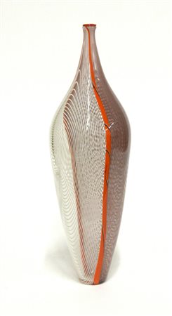 Vaso a bottiglia a canne e mezza filigrana nei colori lattimo, ametista e arancione. Murano, 1997. Firmato e datato "P.d.A. Zilio Andrea anfora Murano 1997". (h cm 45)