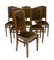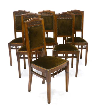 Gruppo di sei sedie liberty lin legno massello con schienale intagliato a motivo floreale, seduta e schienale rivestiti in tessuto marrone. Italia, anni '10. (cm 42,5x101x43) (lievi difetti)
