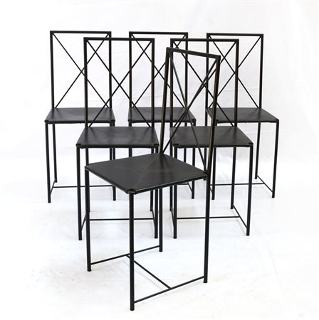 Lotto di sei sedie modello "Moka". Produzione Flexform, Italia, anni '80. Struttura in tondino d'acciaio verniciato nero e seduta in pelle nera. (cm 38,5x93,5x37,5) (lievi difetti)