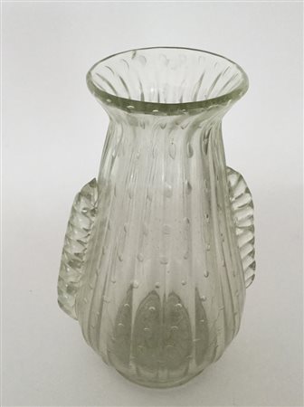 Vaso a morise in vetro incolore costolato con inclusione regolare di bolle. Murano, anni '30. (h cm 28) (lievi difetti)