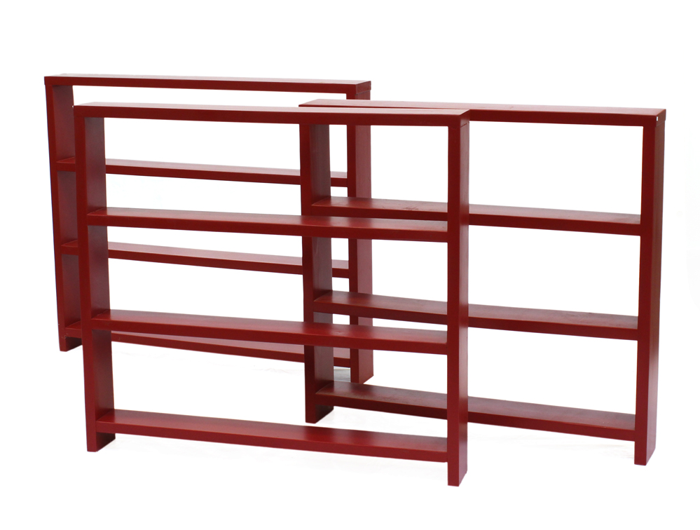 Lotto di tre librerie in legno verniciato rosso. Italia, 1989. (Misure diverse)