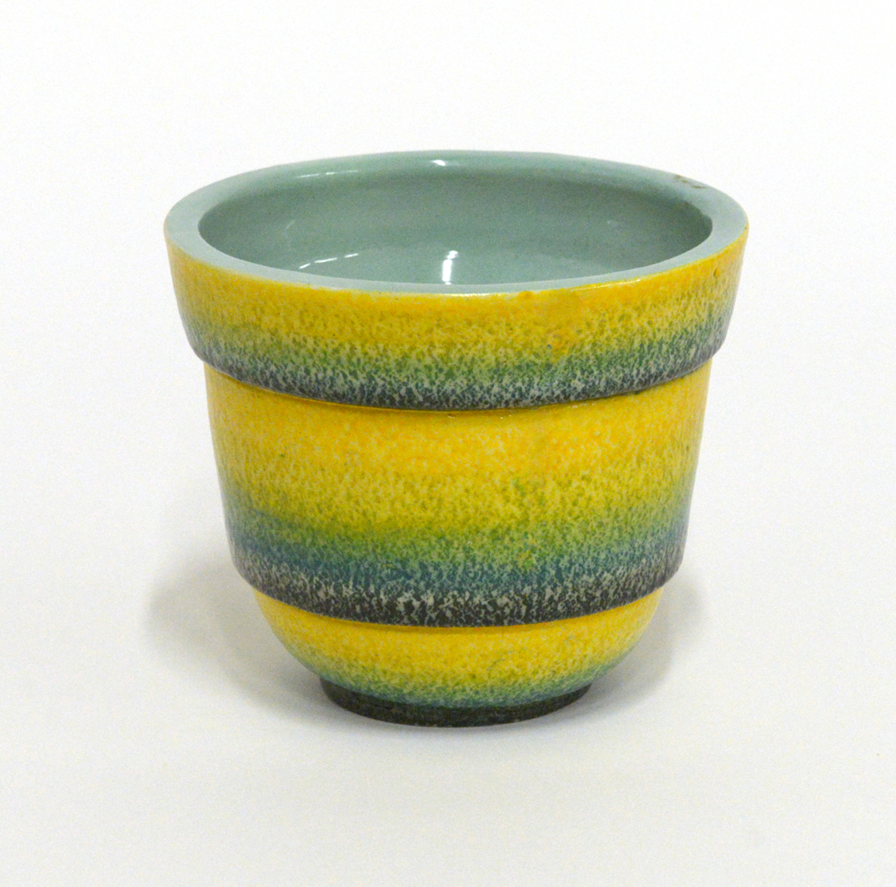Vaso in ceramica smaltato a fasce orizzontali blu, celeste, verde, giallo. Albisola, anni '30. Siglato sotto la base. (h cm 11,5) (lievi difetti)