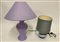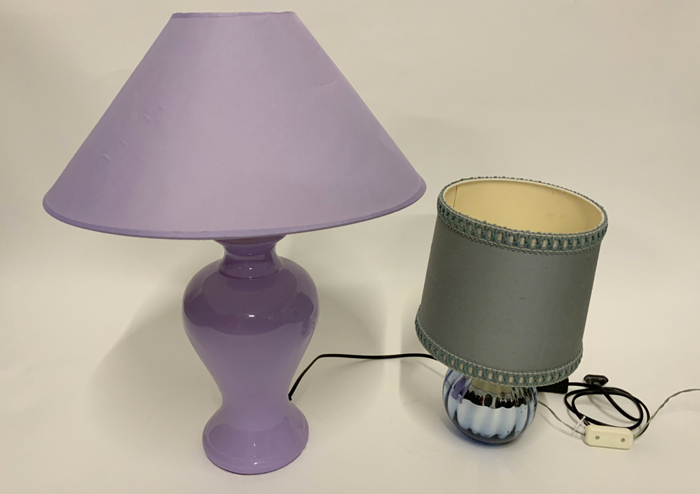 Lotto di due lampade da tavolo di diverse manifatture con corpi in porcellana e paralumi in stoffa. Produzione recente. (h max cm 40) (lievi difetti)