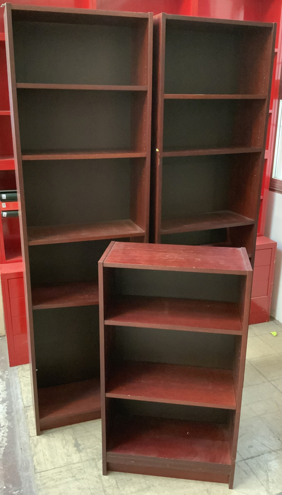 Lotto composto da una coppia di librerie in legno con piani regolabili e una più piccola di medesima fattura. (cm 60x202x28 e cm 60x106x28) (difetti)