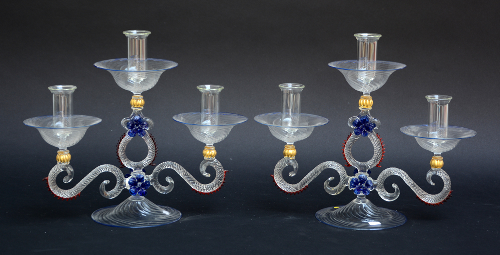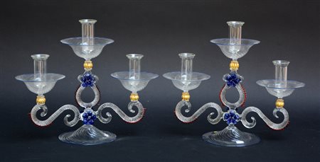 Manifattura di Murano Coppia di candelieri a tre luci in vetro soffiato incolo