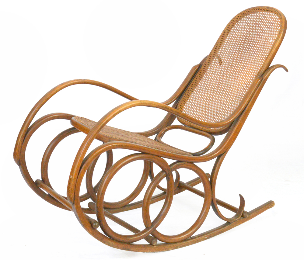 Sedia a dondolo in faggio curvato al vapore e rivestimento in paglia di Vienna.
