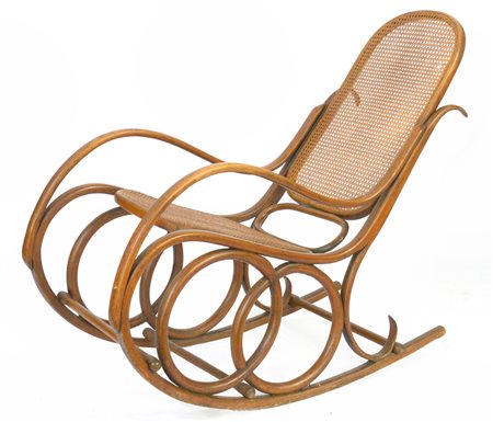 Sedia a dondolo in faggio curvato al vapore e rivestimento in paglia di Vienna. Italia, anni '10/'20. (cm 53x103x120) (lievi difetti)