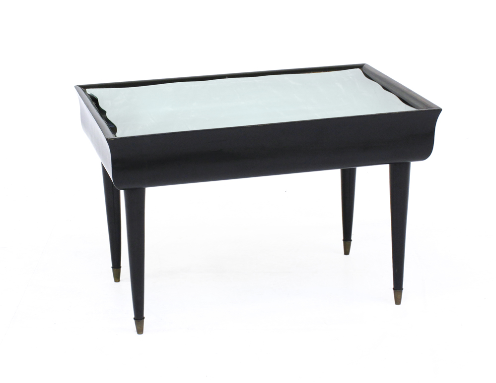 Tavolino con struttura in legno ebanizzato, piano in cristallo molato gambe tronconiche e piedini in ottone. Italia, anni '30. (cm 82x52x50) (lievi difetti)