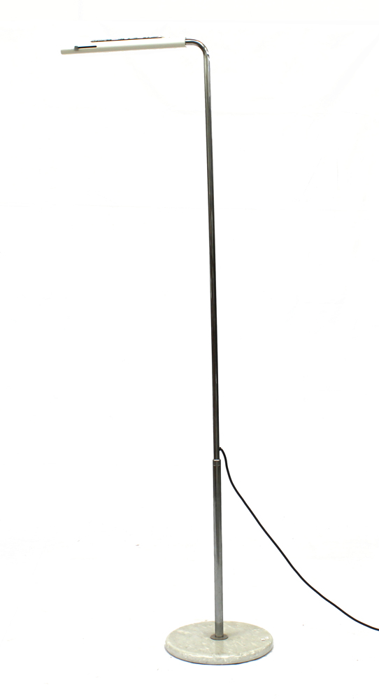 Lampada in metallo laccato nero e cromato, altezza regolabile, produzione Skipper modello "Mezzaluna". Produzione Skipper, Italia, 1975. Metallo laccato laccato bianco e cromato, altezza regolabile. (h cm 187) (lievi difetti)