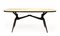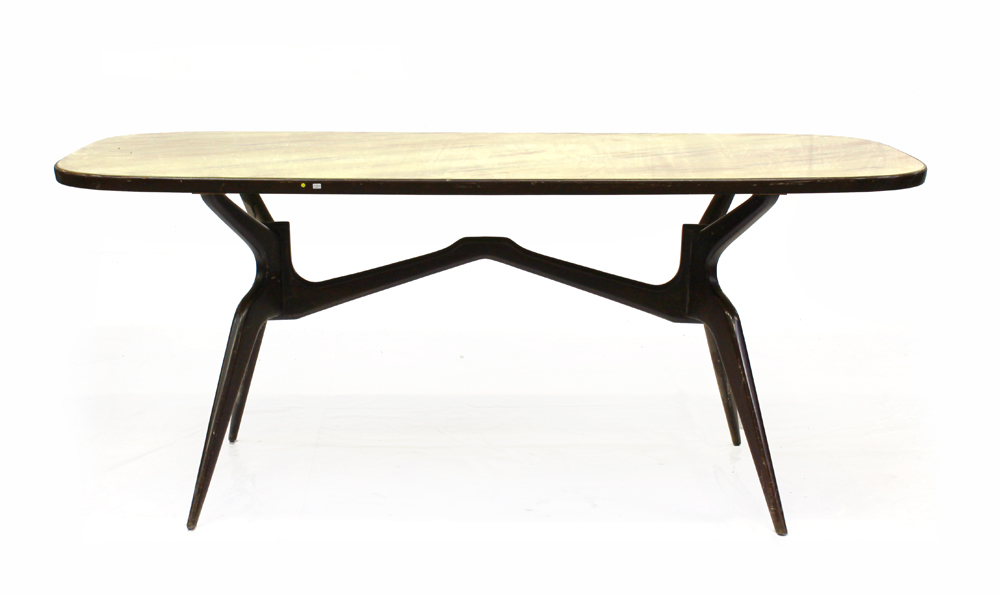 Tavolo da pranzo ovale con gambe sagomate riunite da traversa, piano in vetro laccato a finto marmo. Italia, anni '40. (cm 187x83x78) (difetti)