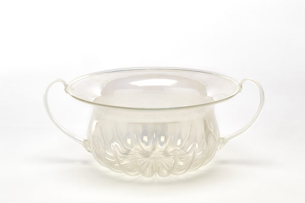 Ciotola biansata in vetro trasparente leggermente iridato e corpo costolato. Murano, anni '20. (h cm 15,8; d cm 32,5)