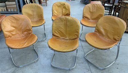 Lotto di sei sedie modello "Sabrina ". Produzione Rima, Italia, anni '70. Struttura in tubolare di acciaio cromato e cuscini rivestiti in similpelle color sabbia. (cm 50x80,5x64) (difetti e mancanze)