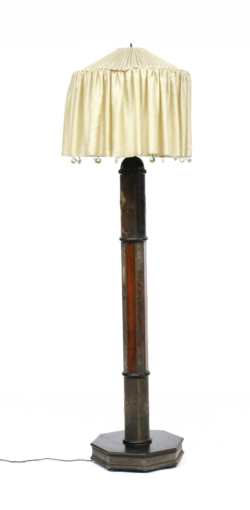 Lampada da terra in legno e cuoio decorata a motivi floreali. Paralume in seta guarnito da piccole sfere in vetro trasparente. Germania, 1910ca. (h cm 182) (lievi difetti)