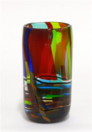 Vaso cilindrico in vetro massello con canne e murrine policrome. Murano, seconda metà secolo XX. Firmato a punta sotto la base "Afro Murano". (h cm 25; d cm 12,5)