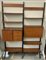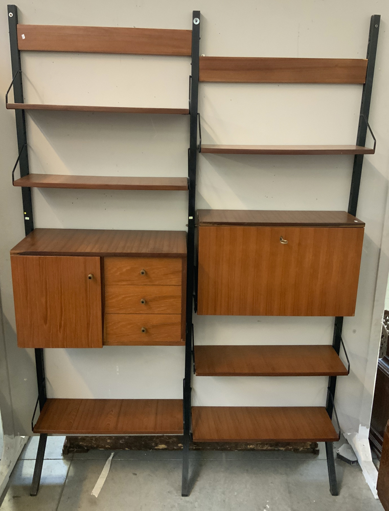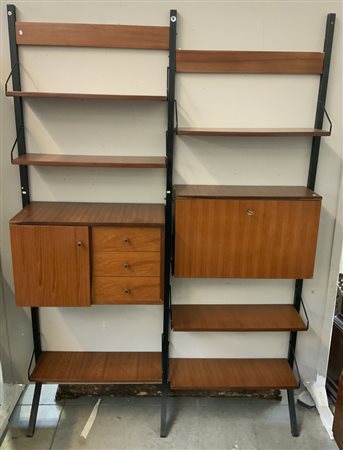 Libreria con montanti in acciaio laccato nero, ripiani a stipi e cassetti ed ante impiallacciate in legno. Italia, anni '60. (cm 150x220x35) (difetti)