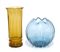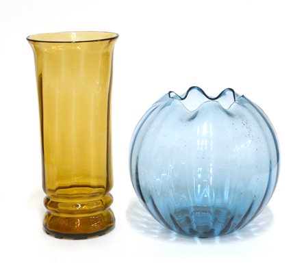 Lotto di due vasi costolati, dei quali uno di forma sferica in vetro soffiato trasparente azzurro, l'altro di forma cilindrica in vetro soffiato pagliesco. Seconda metà secolo XX. (h cm 28, h cm 39,5)