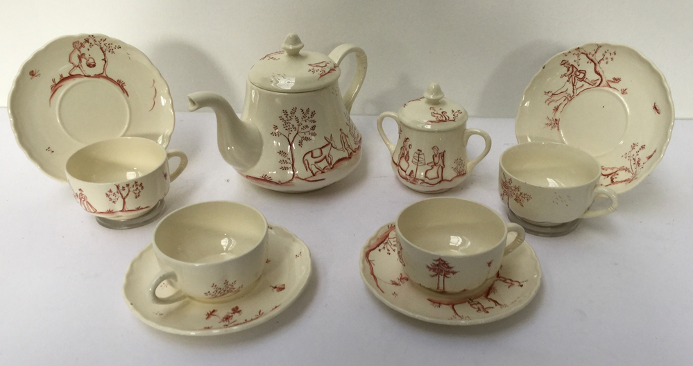Parte di servizio da tè in ceramica composto da teiera, zuccheriera e dieci tazze con undici piattini, decorato a scene di vita all'aperto in monocromia su fondo crema. Laveno, secolo XX. Marcato sottol a base con il simbolo della manifattura. (lievi difetti)