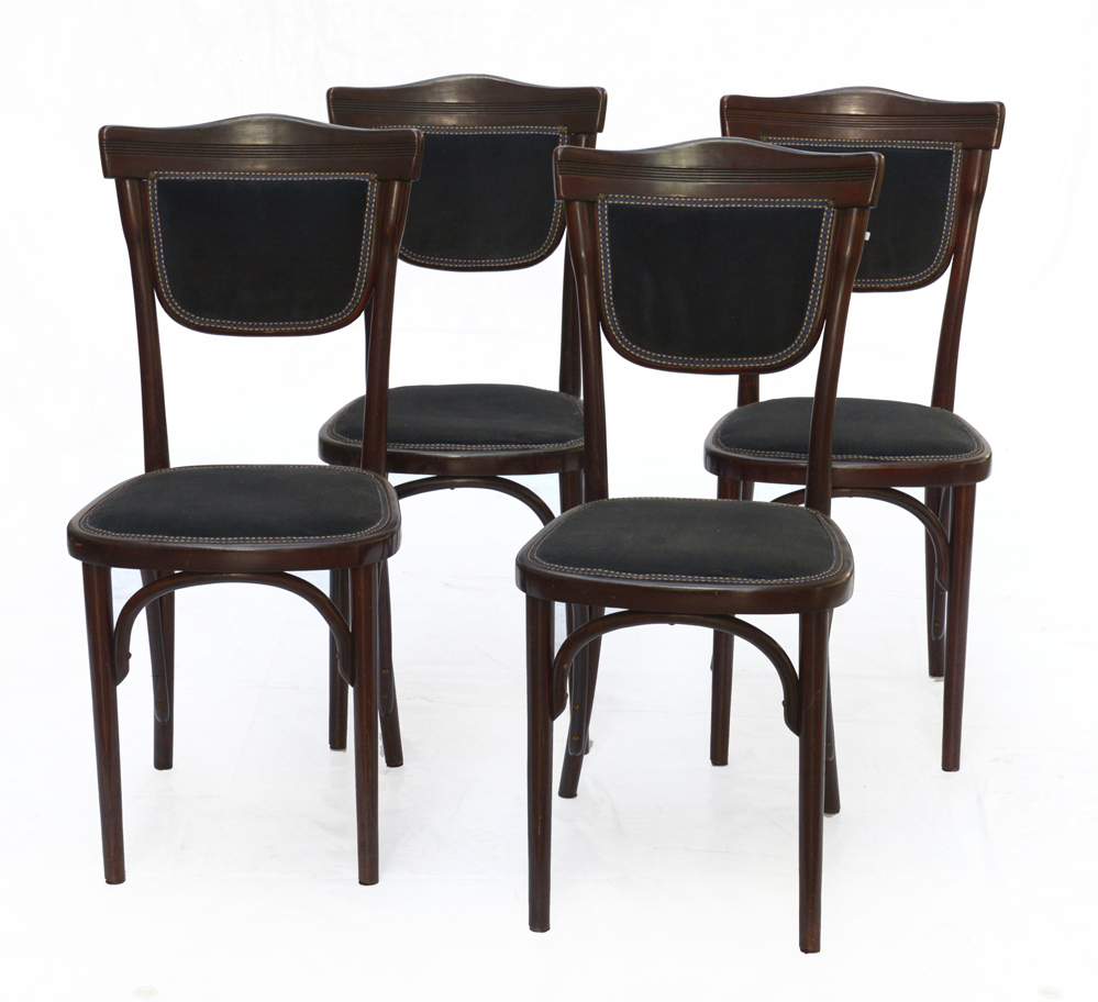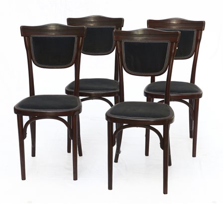 Gruppo di quattro sedie. Austria, inizio secolo XX. Legno di faggio curvato tinto seduta e schienale in velluto blu. Stampigliate a fuoco. (cm 40x90x48) (lievi difetti)