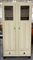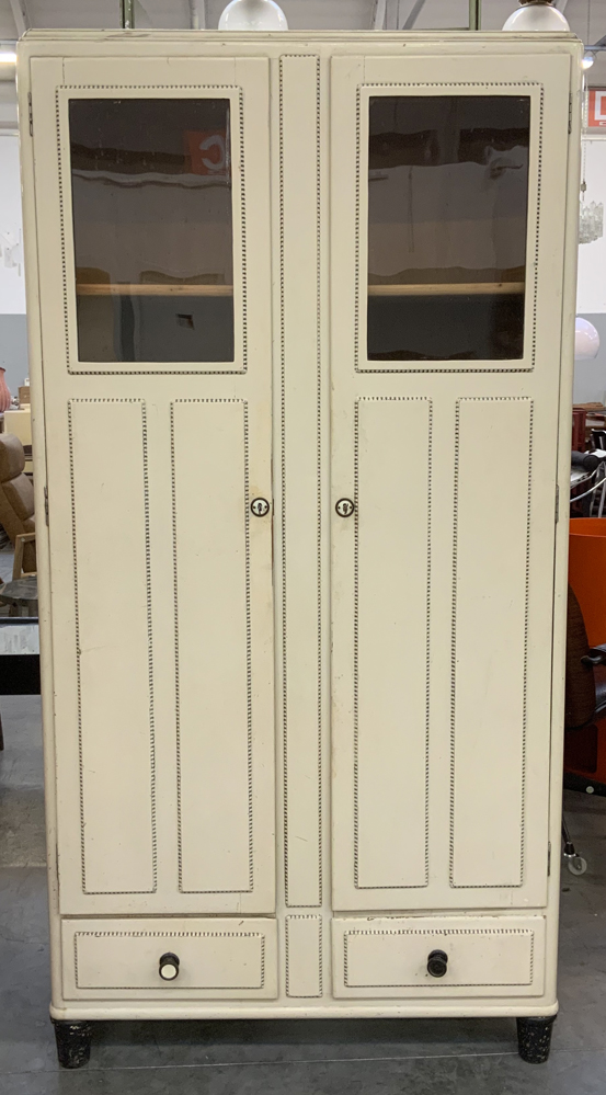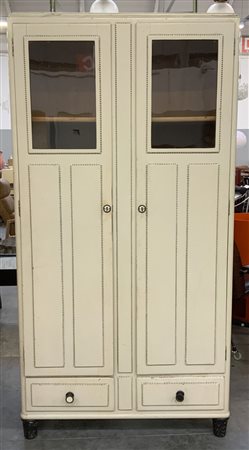 Credenza in legno verniciato bianco a due ante con vetrinetta nella parte superiore e due cassetti nella parte inferiore. Gambe troncoconiche e pomoli in ottone. Italia, anni '30/'40. (cm 100x198x42) (difetti)