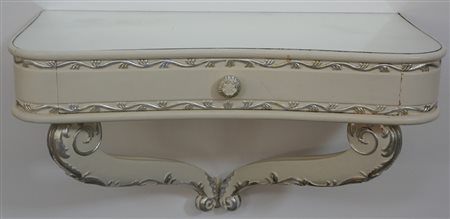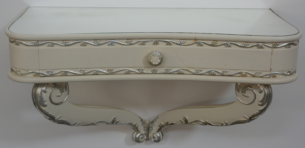 Coppia di comodini pensili a mensola in legno dacero intagliato a racemi verniciato bianco e argento ad un cassetto sottopiano. Piano rivestito in vetro a specchio. Anni '40. (cm 71x40x31,5) (lievi difetti e restauri)