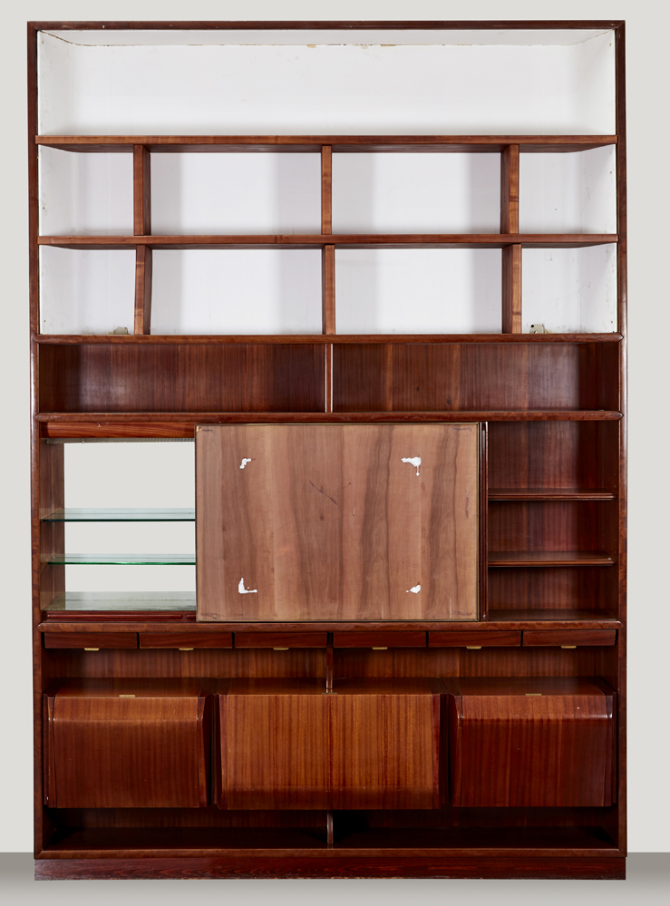 Monumentale mobile bar-libreria in legno di mogano impiallacciato, bordato e massello. Parte bassa con tre vani apribili a ribalta. Faccia a sei cassettini con maniglia in ottone. Scomparto centrale ad anta scorrevole portastampe in legno e vetro. Interni illuminati a ripiani di cristallo molato, fondo specchiato, base in vetro decorato sulla superficie inferiore. Pianetti portabicchieri estraibili. Parte superiore con due ripiani a giorno originali e due ripiani non coevi in legno di noce. Varedo, 1955ca. (cm 242x348x46,5) (difetti e modifiche)