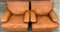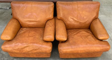 Coppia di poltrone imbottite rivestite in pelle color terra di Siena. Italia, anni '70. (cm 90x70x90) (difetti)