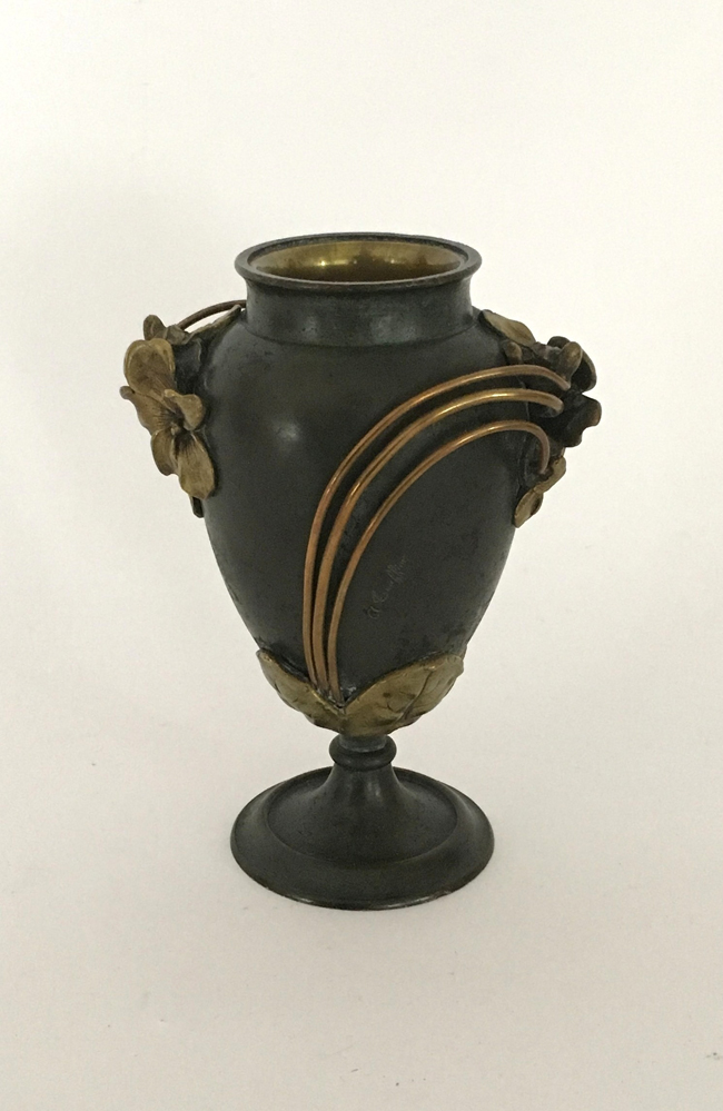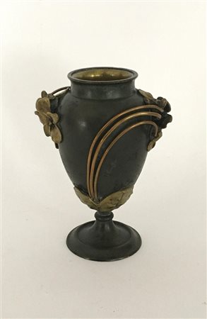 Vasetto in bronzo con decoro floreale in ottone. Francia, inizio secolo XX. Firmato a incussione. (h cm 13,5)