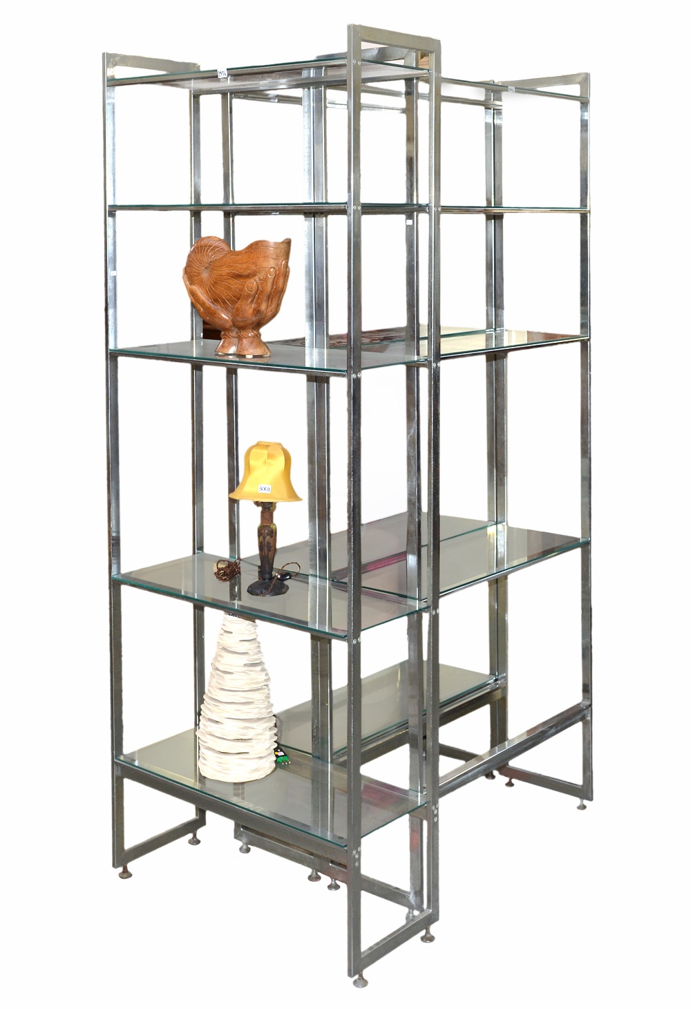 Gruppo di tre librerie a cinque ripiani con struttura in profilato metallico cromato e ripiani in cristallo molato. Secolo XX. (cm 76x189x30) (difetti e mancanze)