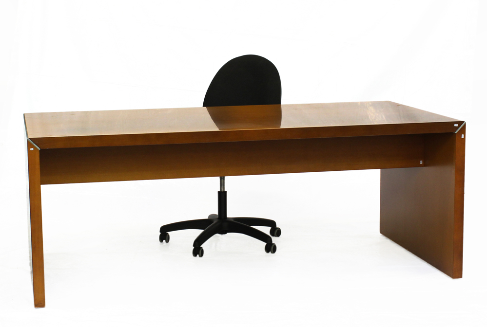 Grande scrivania in legno impiallacciato unita a una poltroncina girevole da ufficio. Italia, secolo XX. (Scrivania cm 200x76x100; poltroncina cm 50x102x60)