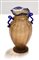 Vaso biansato a corpo costolato in vetro soffiato ametista chiaro con anse e fili in vetro blu applicato a caldo. Anni '10/'20. (h cm 21) (lievi difetti)