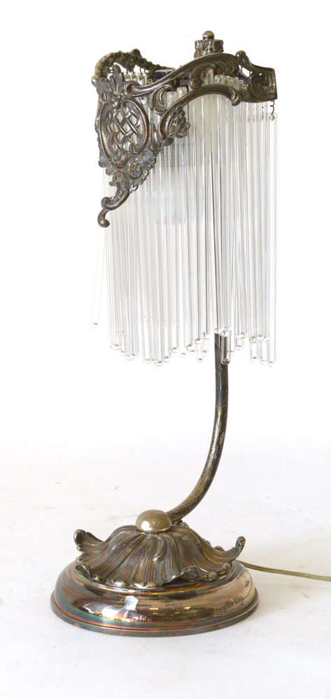 Lampada da tavolo di gusto liberty in argento "925" e matello argentato con paralume a pendenti in vetro. Milano, secolo XX. (h cm 43) (difetti)
