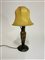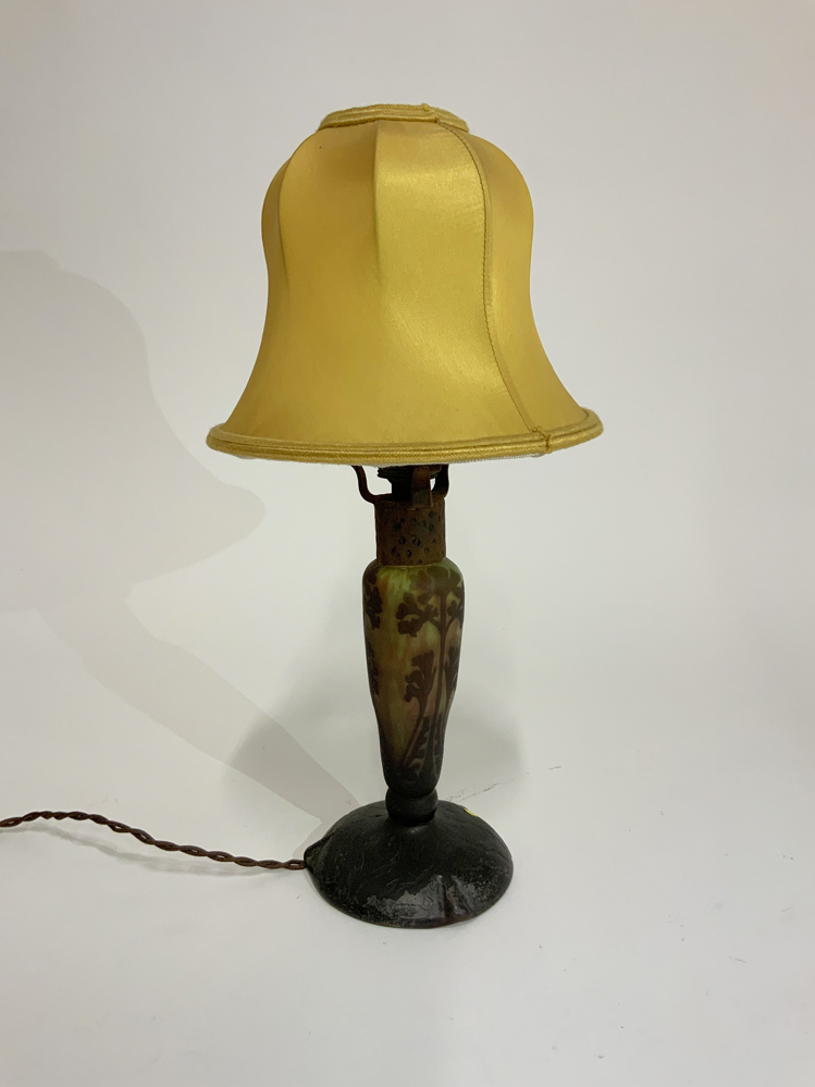 Piccola lampada da tavolo in vetro cammeo marrone e giallo acidato sulla superficie esterna. Nanacy, 1900ca. Firmato sulla base e con croce di Lorena. (h cm 32,5) (difetti e restauri)