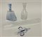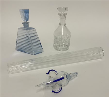 Lotto composto da un tappo in vetro trasparente incolore con applicazioni a caldo di vetro trasparente blu, una bottiglia Baccarat in cristallo con tappo, una bottiglia in vetro azzurrino con costolature orizzontali e un vetro per lampada da terra Venini. (misure diverse) (difetti)