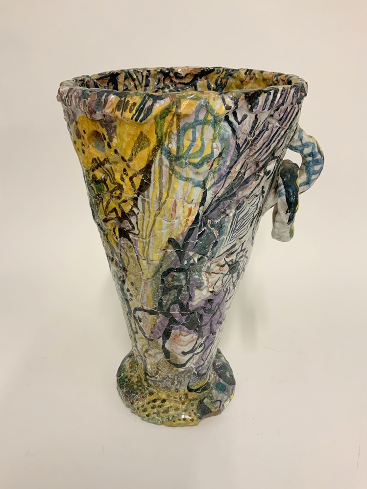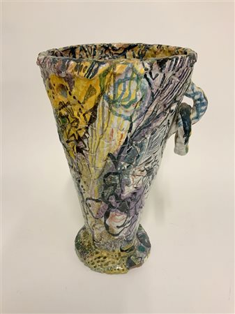 Grande vaso biansato in terracotta modellata a mano e smaltata in policroma. (h cm 53; d cm 32) (difetti e restauri)