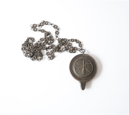 Antico porta pallini da caccia in rame argentato con interessante catena.