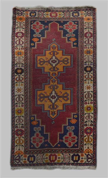 Decoro con due medaglioni color zafferano su fondo bordeaux (cm 230x120) (difetti e rapature)