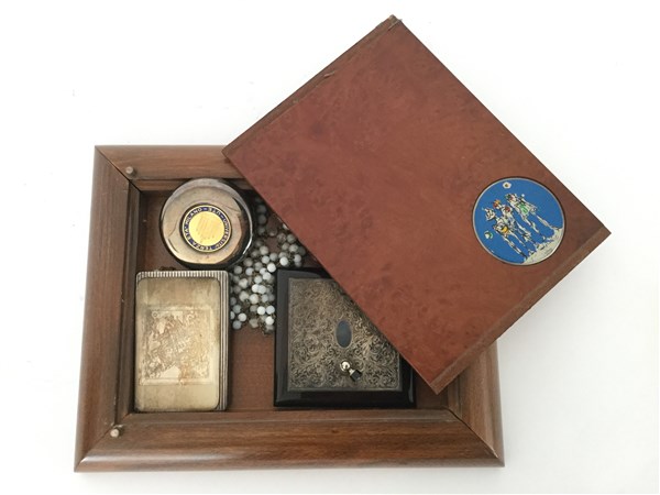 Scatola in legno con placca in argento con disegno di F. Rognoni contenente alcune medaglie ed oggetti in lamina d'argento