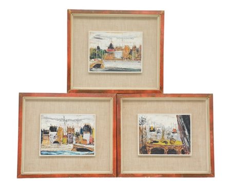 Tre dipinti ad olio su cartoncino di diverso soggetto (cm 15x19) uno firmato, in cornice
