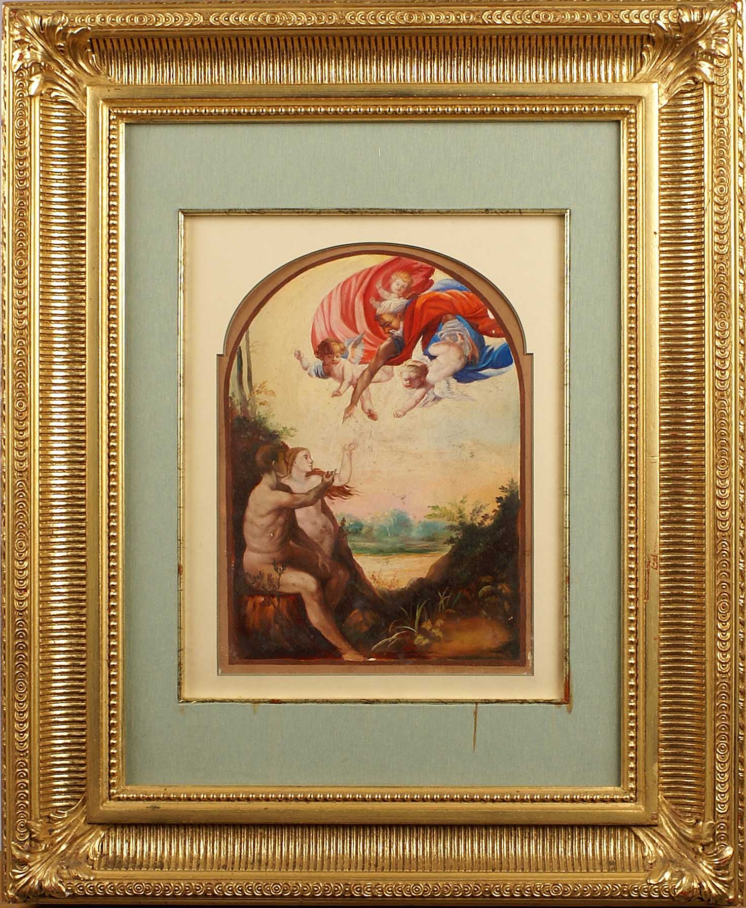 SCUOLA ITALIANA XIX Sec. "La cacciata dal Paradiso di Adamo ed Eva", olio su cartoncino, entro cornice in legno dorato Dim. 28x20 cm.