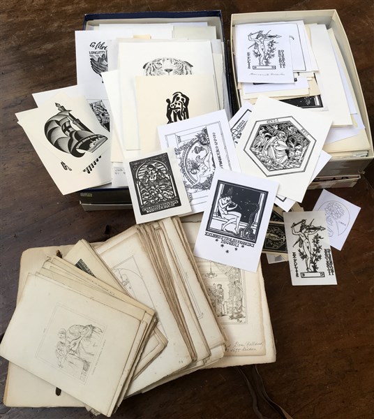 Lotto composto da due scatole contenenti numerosi ex libris ed una raccolta di