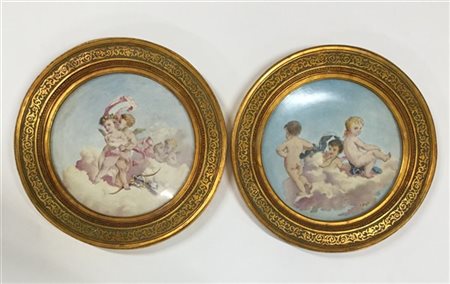 Coppia di piatti in porcellana decorata in policromia con putti (d cm 33)uno fi