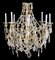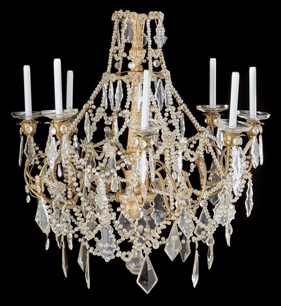 Lampadario a otto luci con fusto in legno tornito intagliato e dorato a palmette. Reggicandele di forma mossa in metallo dorato decorate a perlinature e pendagli in cristallo. Genova, secolo XVIII (h. cm 100) (difetti e mancanze)