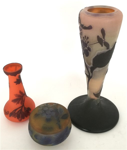 Lotto composto da un vaso in stile Gallè ed una scatola firmata Pieynaud ed un vasetto firmato Richard. (Misure diverse)
