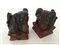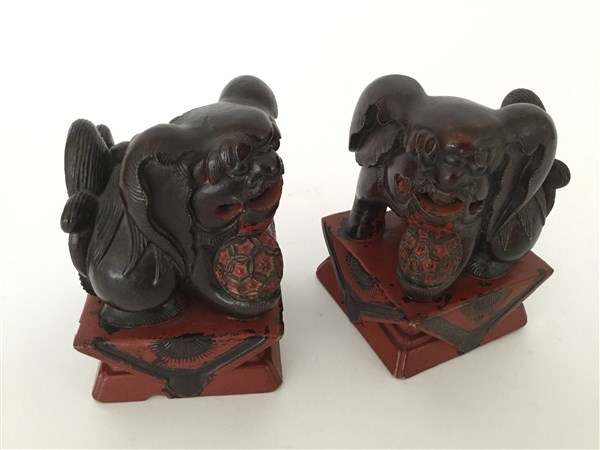 Coppia di leoncini in legno intagliato e laccato a fondo rosso poggianti su basi squadrata (h. cm 14) Giappone, sec. XX