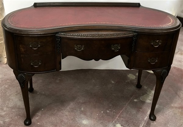 Scrivania a fagiolo a cinque cassetti intagliate allattacco con conchiglie stilizzate, piano in marocchino rosso impresso in oro (cm 120x78x57)(difetti)