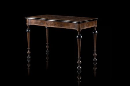 Tavolo di forma sagomata con piano e fascia lastronati in radica, gambe tornite. Capitelli e profili ebanizzati. Secolo XIX (cm 125x80x72) (difetti)